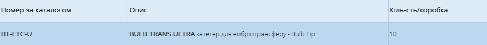 BULB TRANS ULTRA катетер для ембріотрансферу – Bulb Tip використовується для введення запліднених in vitro (IVF) ембріонів у порожнину матки.