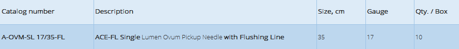 The ACE-FL Single Lumen Ovum Pickup Needle with Flushing Line is used for laparoscopic or ultrasound-guided transvaginal retrieval of oocytes from ovarian follicles.