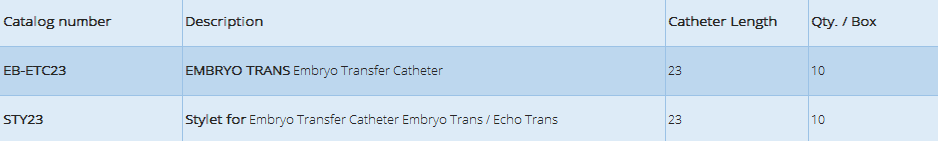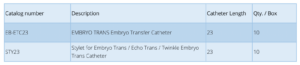 The EMBRYO TRANS Embryo Transfer Catheter is used to introduce in-vitro fertilized (IVF) embryos into the uterine cavity.