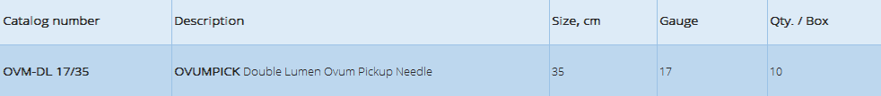The OVUMPICK Double Lumen Ovum Pickup Needle is used for laparoscopic or ultrasound-guided transvaginal retrieval of oocytes from ovarian follicles.